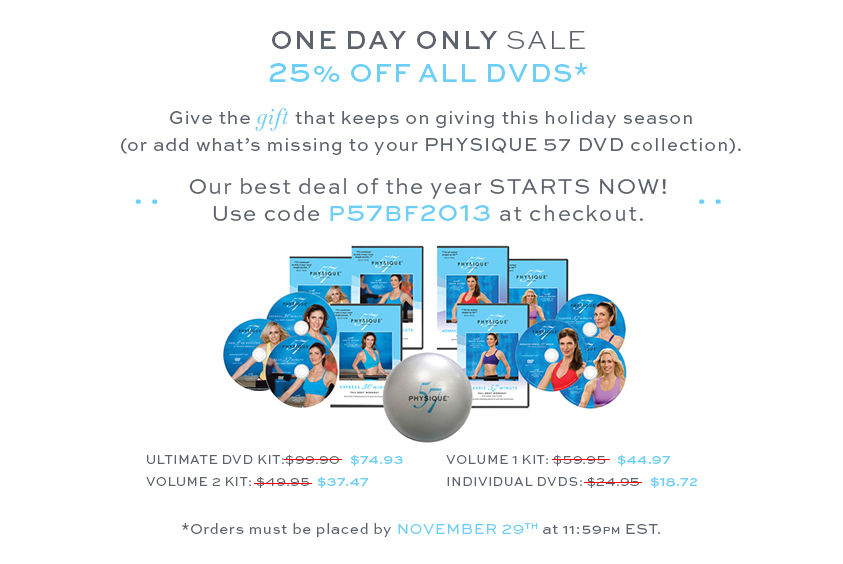For ONE DAY ONLY, we are having a Black Friday SALE! Start shopping our Physique 57 signature barre workout DVDs at a 25% discount. Use code P57BF2013 at checkout.