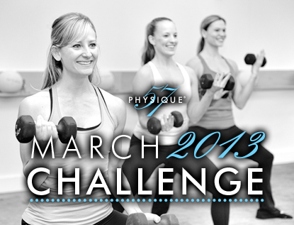 Physique 57 offers monthly barre challenges to help keep you accountable for your workouts and motivated throughout the month. Spring into fitness with our March Challenge. With warmer weather approaching, we want to help you get an early start on sculpting your swimsuit-worthy body! Bonus! Tweet, Instagram or email us your photos to [email protected] at the end of the challenge with the hashtag #Physique57Challenge for a chance to WIN a Physique 57 burnout tee (Value: $57)! One winner will be chosen. New York and Los Angeles Studio Challenge Work out 16 days this month and come to two of those classes with a friend.* Map out your schedule each Sunday before the week starts and try to hold yourself accountable to that schedule. 10 Mixed 2 Intermediate 1 Advanced 3 Physique Cardio DVD Challenge Work out 24 days this month. Leave a comment below if you plan to participate in this challenge. Check back regularly throughout the month to help stay accountable to yourself and each other!
