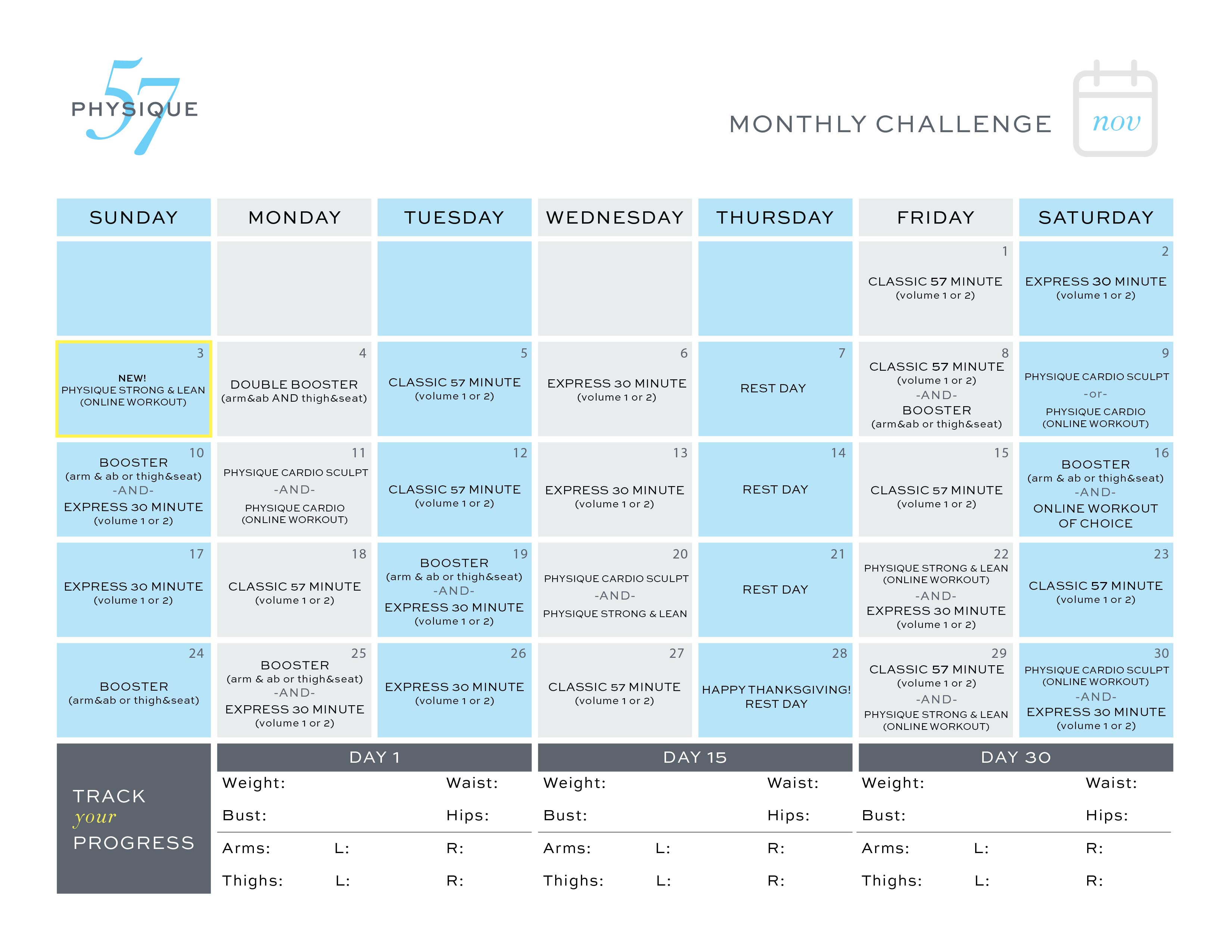 Physique 57 offers monthly barre challenges to help keep you accountable for your workouts and motivated throughout the month. Thanksgiving is quickly approaching and we could all use a little extra motivation to stay on track through the holidays. Stick to this challenge and we promise to help you get fit (and feeling fabulous) just in time for your family reunion and holiday festivities!