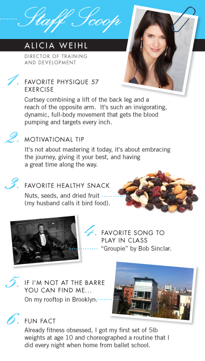 We’re excited to launch our new blog series, Staff Scoop! Each month we will introduce you to someone from the Physique 57 Staff. We’re starting this series with our Director of Training and Development, Alicia Weihl. Here, she shares her favorite Physique 57 exercise, motivational tip and more..