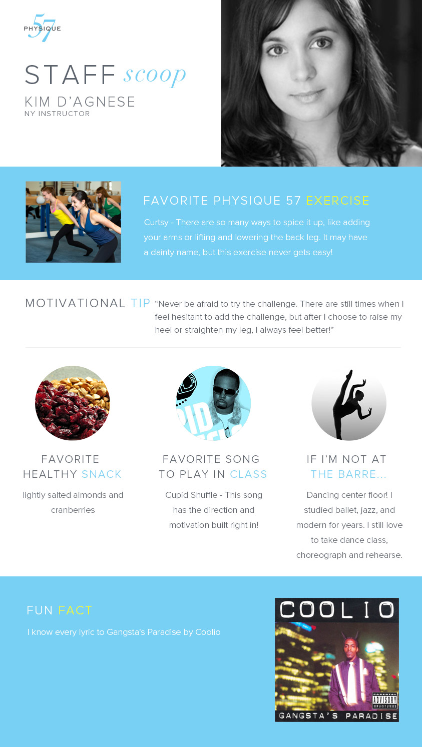 Next up in our Staff Scoop blog series is a feature on NY instructor and Master Trainer Kim D’Agnese! Here she shares her favorite Physique 57 exercise, healthy snack preferences and more.