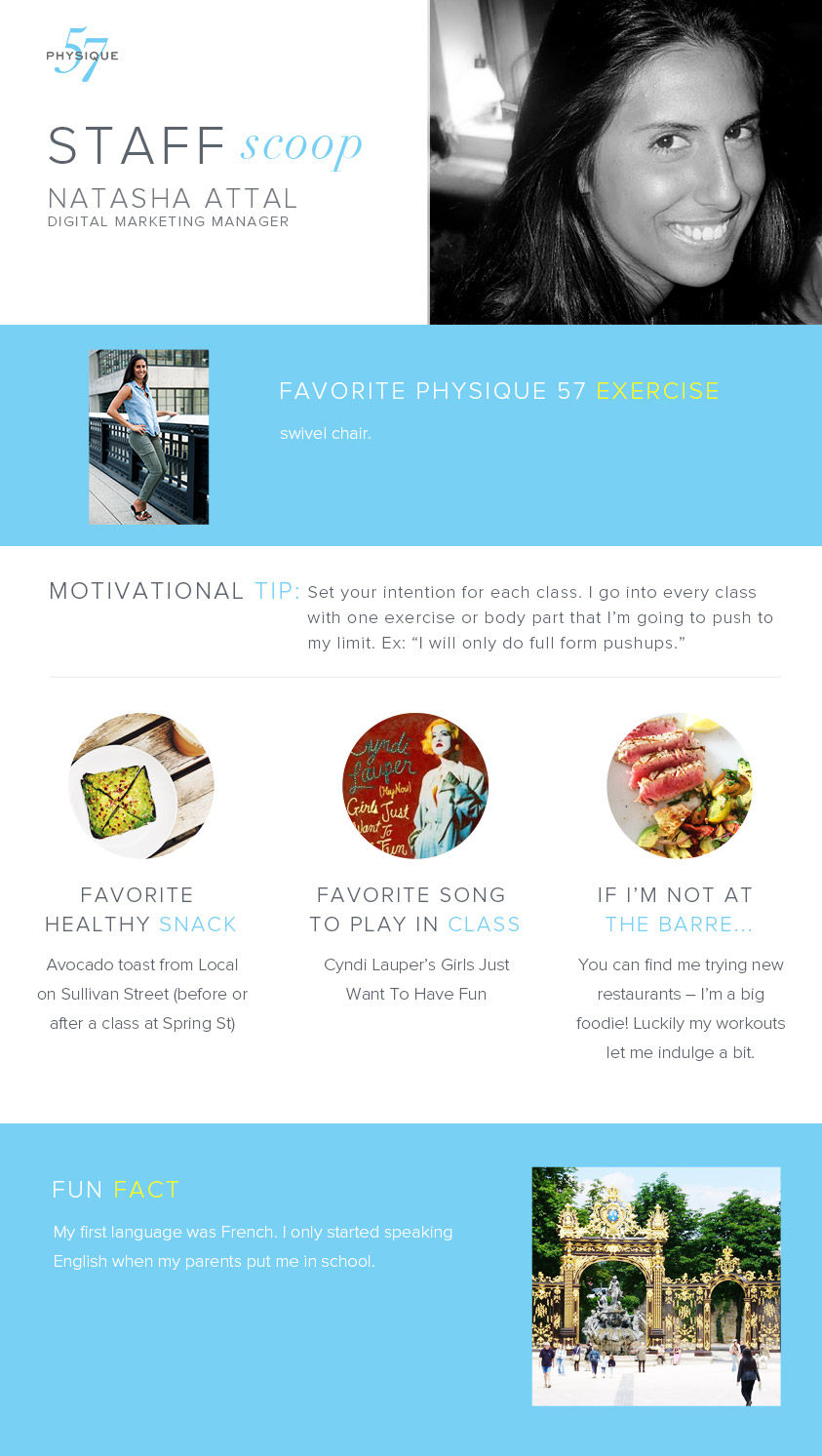 Check back next month to learn more about the Physique 57 Staff and feel free to comment with who you would like to see on the next Staff Scoop! And if you ever want to connect with Natasha Attal, feel free to chat with her on Twitter or Instagram. She’s always thrilled to meet (online and in-person) Physique 57 clients!